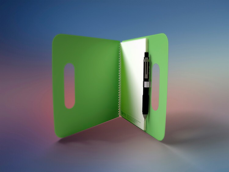 Блокнот с вырубной обложкой и брошюровкой на «пружину» по короткой стороне («пружина» сверху). Цельная обложка вырубная и схема вырубки (конструкция обложки) такова, что в сложенном виде на обложке образуется специальный карман, выступающий в качестве держателя для авторучки. Материал обложки — мелованный двухсторонний картон плотностью 270 гр., полноцветная печать с одной стороны. Внутренний блок: объем 50 листов, немелованная бумага «ВХИ» плотностью 80 гр.