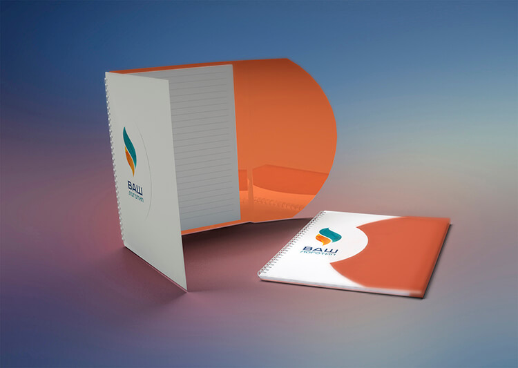 Блокнот с твёрдой обложкой и брошюровкой на «пружину» по длинной стороне («пружина» сбоку). Передняя и задняя обложки: В основе переплетный картон толщиной 1,5 мм. Сверху на основу приклеиваются верхние части обложек, отпечатанные полноцветной печатью и покрытые глянцевой или матовой плёнкой. Такой способ изготовления обложек называется технологией кашировки. В результате получается очень жёсткая обложка, стойкая к деформации. Внутренний блок: объем 50 листов, немелованная бумага «ВХИ» плотностью 80 гр. Пластиковый держатель для крепления авторучки.
