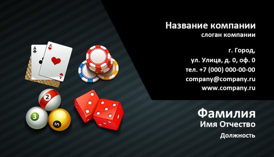 Владельцы казино, профессиональные крупье и другие специалисты по азартным играм должны иметь под рукой соответствующие визитные карточки. Визитки серии «Игры», заказанные в типографии «Артикул», оправдают ваши ожидания на все 100%. Мы позаботились о том, чтобы шаблоны визиток обязательно нашли своего клиента. Для этого есть множество вариантов фоновых рисунков, цветов и оттенков, тематических картинок, шрифтов.